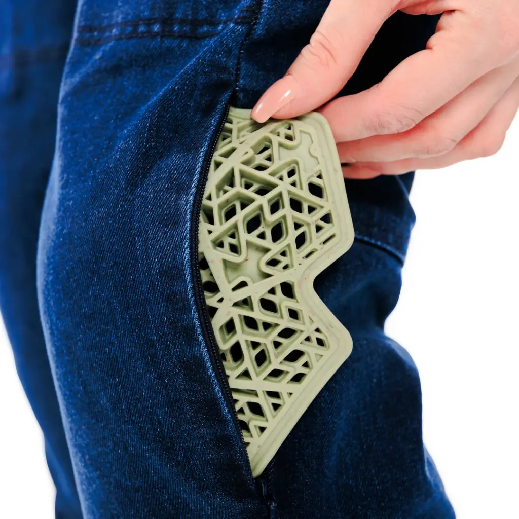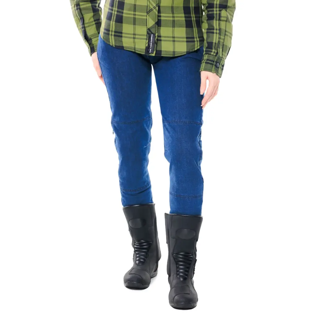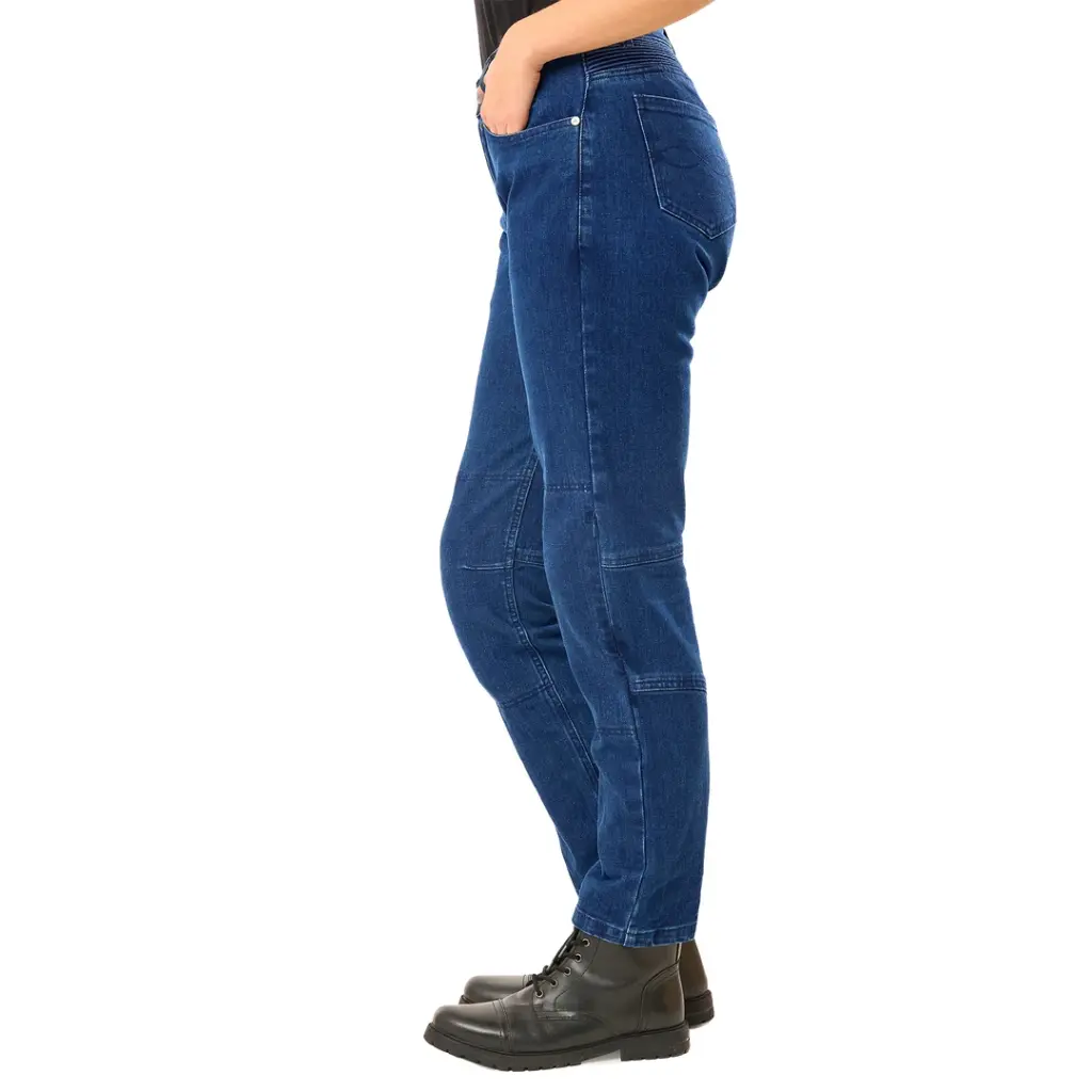 Rozciągliwe panele na plecach zwiększają mobilność i komfort. Wyprofilowane kolana dostosowują się do naturalnej pozycji na motocyklu. Kobiecy, dopasowany krój – stylowy na ulicy, funkcjonalny na drodze.