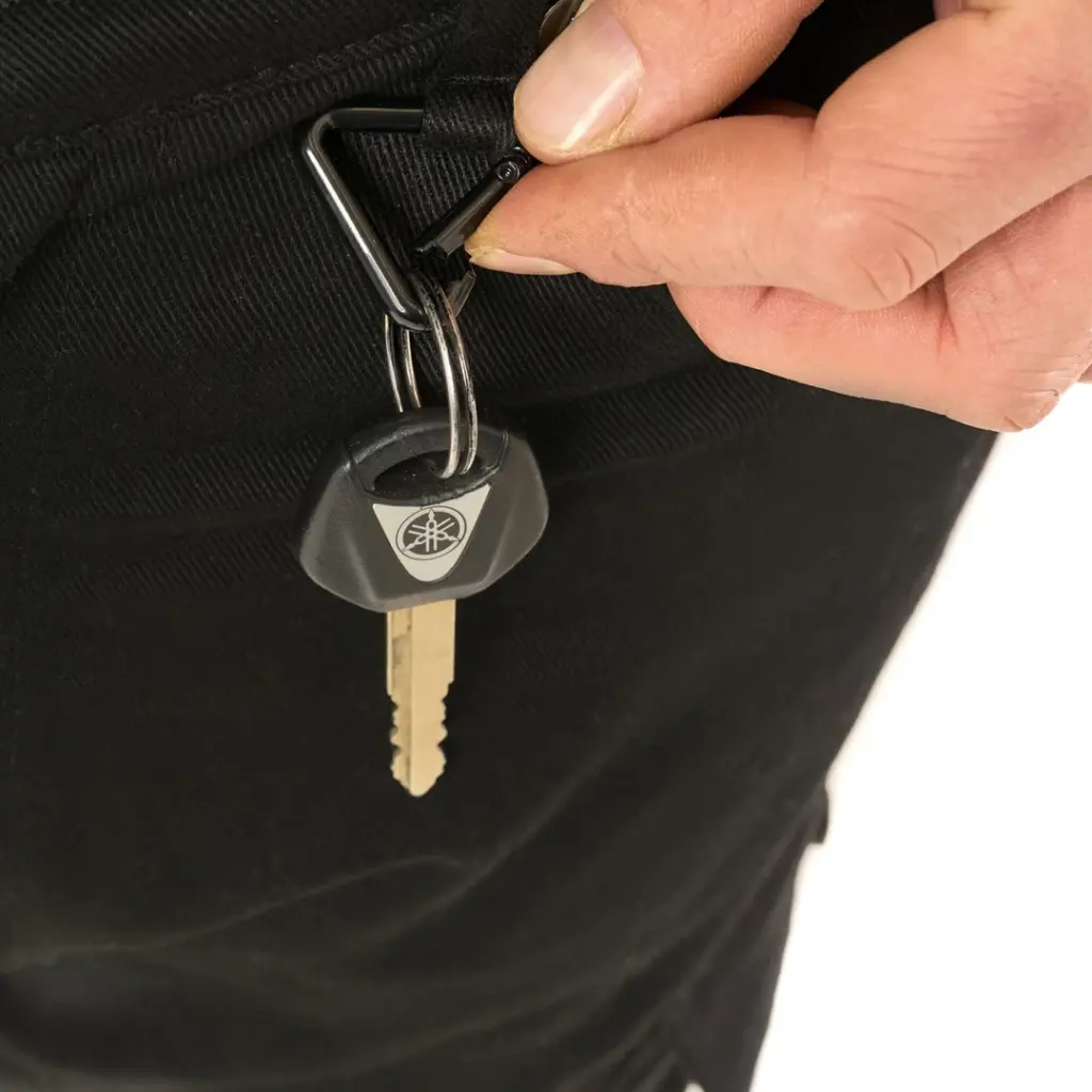 Dwie duże kieszenie cargo z markowanymi zatrzaskami na przyciski. Przechowujesz narzędzia, dokumenty, drobne rzeczy – wszystko bezpiecznie i pod ręką. Do tego wbudowany uchwyt na klucze.